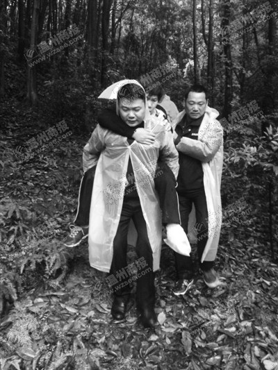 两位民警和三位协警队员小跑着赶上山,立即轮流背范女士下山。在经历了近半小时的接力救援后,终于将范女士安全送到山下。随即,民警又将她送至附近医院查看。