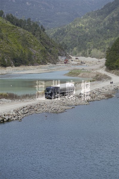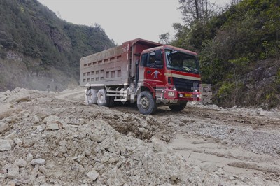 在这之后的一路上,不断有同样满载砂石、悬挂外地牌照的挂车在我们身边交会。胡先生说,他们会跟之前的车辆一起列队待发。