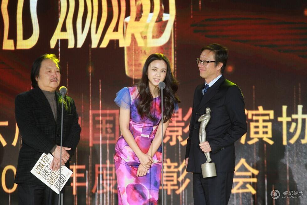 腾讯娱乐讯(图/薛建宇)2015年4月12日,第六届中国电影导演协会2014年度表彰大会颁奖盛典将在京举行,协会主席李少红、终评委主席陈凯歌、冯小刚、黄建新、徐峥、范冰冰、汤唯等导演及明星一一亮相。图为著名演员汤唯、著名导演刘伟强和滕文骥担任颁奖嘉宾。
