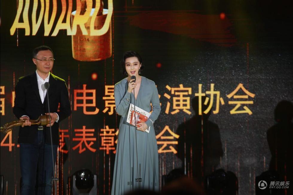 腾讯娱乐讯(图/薛建宇)2015年4月12日,第六届中国电影导演协会2014年度表彰大会颁奖盛典在京举行,协会主席李少红、终评委主席陈凯歌、冯小刚、黄建新、徐峥、范冰冰、汤唯等导演及明星一一亮相。图为范冰冰和光线影业总裁王长田担任颁奖嘉宾。