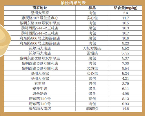 日前,记者在街头小店、便利店、大型超市等处购买了肉包、实心包、菜包、刀切馒头、圆馒头、叉烧包、紫薯馒头等20批次面点,经市质监院检测,铝含量从2.4—14.8mg/kg不等。去年7—8月,“禁铝令”刚出台时,温州市场上部分面点的铝含量检测达300mg/kg,有些甚至达700mg/kg。经过多次整治,目前情况已大为好转。市质检院食化所专家表示,根据本次的检测结果,检测出微量铝,这可能是面粉或泥土本身自带的。并且,铝是一种轻金属,也是地壳中含量最丰富的金属元素。