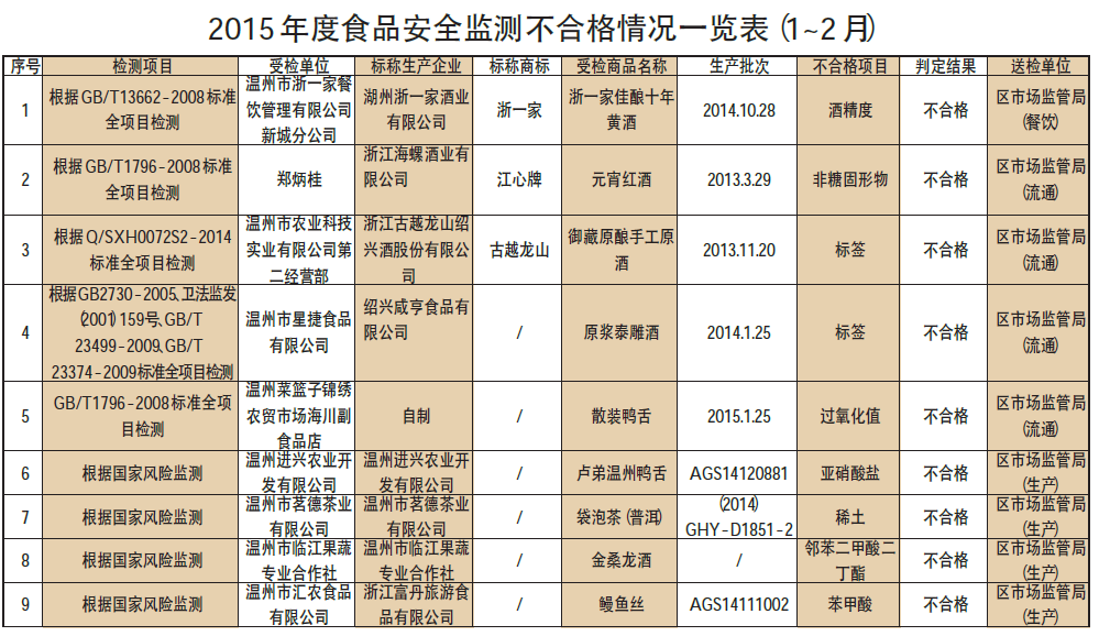 2015年首份鹿城食品黑名单出炉 合格率98.16%