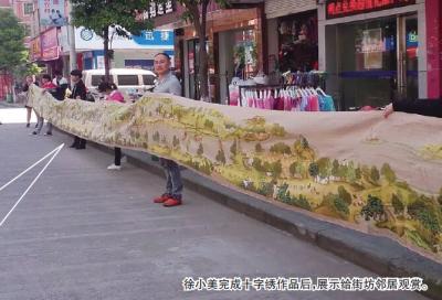 完成后,她立即给女儿、儿子打电话,并请来几位邻居在店门外展开了这幅巨绣。左邻右舍看过画卷后,连连称奇。
