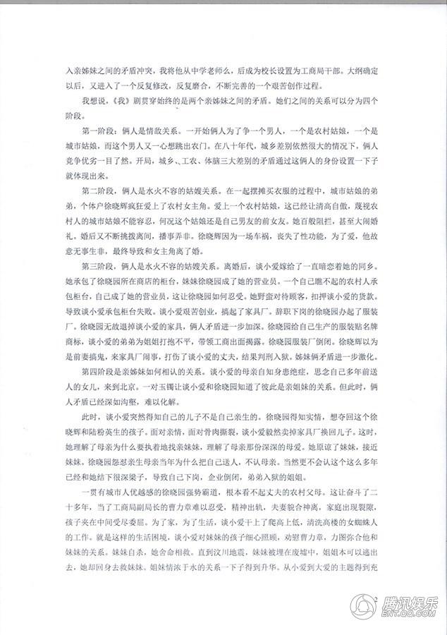 2011年7月22日丫丫公司发来意见,表示:“这一稿故事最大的改变在于增强了佟艳荣(剧中改名谈小爱)和徐晓宁(剧中改名徐晓园)的矛盾纠葛,将两人变成了亲姐妹,这个设定看来是没有什么问题的。”经过不断讨论和反复磨合,2011年8月31日发给丫丫公司的大纲,主要人物、人物性格、人物职业,人物之间的矛盾线索进一步完善。鉴于曹民章(剧中改名曹力章)是学校老师,不利于后面与女主角人物关系发生勾连,以及合理介入亲姊妹之间的矛盾冲突,我将他从中学老师么,后成为校长设置为工商局干部。大纲确定以后,又进入了一个反复修改,反复磨合,不断完善的一个艰苦创作过程。