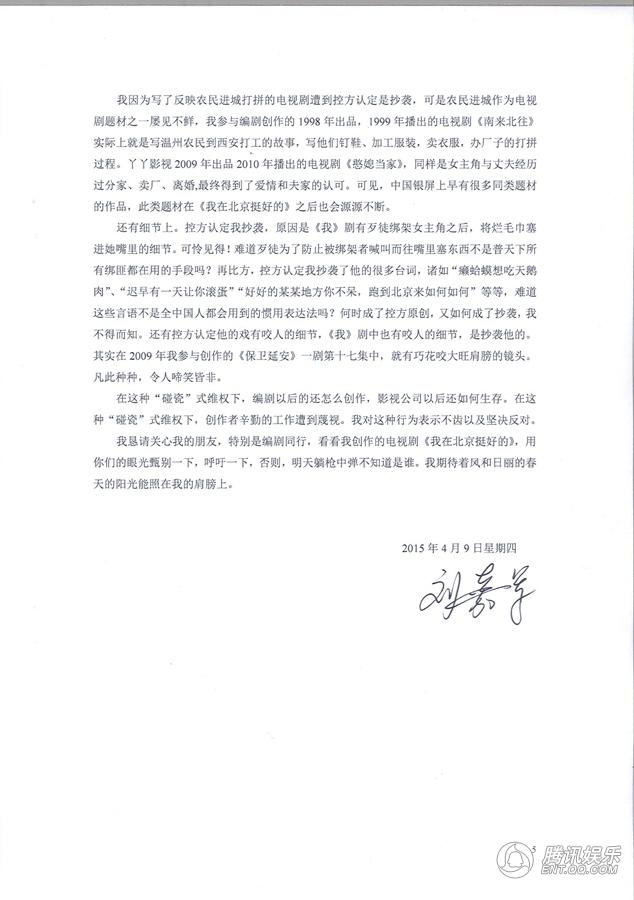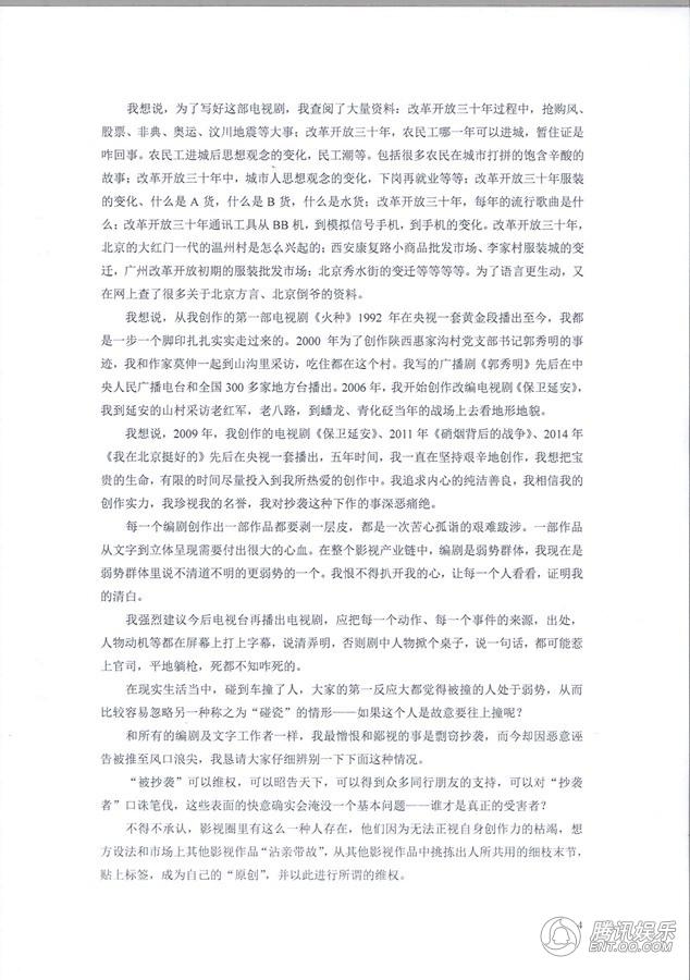 我想说,2009年,我创作的电视剧《保卫延安》、2011年《硝烟背后的战争》、2014年《我在北京挺好的》先后在央视一套播出,五年时间,我一直在坚持艰辛地创作,我想把宝贵的生命,有限的时间尽量投入到我所热爱的创作中。我追求内心的纯洁善良,我相信我的创作实力,我珍视我的名誉,我对抄袭这种下作的事深恶痛绝。