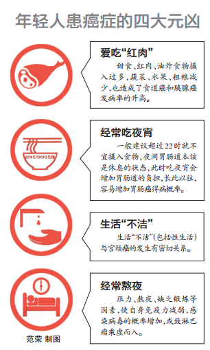 正常情况下,40岁以上才会被列为癌症的高危人群,癌症的高发年龄集中在60岁前后。过去40岁以下的病例通常伴有家族史,但目前发现,越来越多该年龄段的癌症病人都是“身家清白”,对此医学上普遍认为饮食偏重“红肉”(指的是在烹饪前呈现岀红色的肉,如猪肉、牛肉、羊肉等哺乳动物的肉,含有很高的饱和脂肪;相对的禽肉、鱼肉、虾蟹肉等被称为“白肉”)、经常吃夜宵、生活“不洁”、长期熬夜等四大因素是导致中青年患癌的致病因。