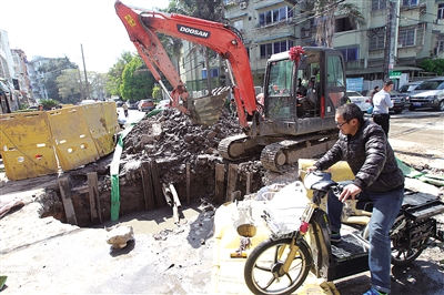 市区高田路上,道路再次开挖施工影响了市民出行。 苏巧将 摄