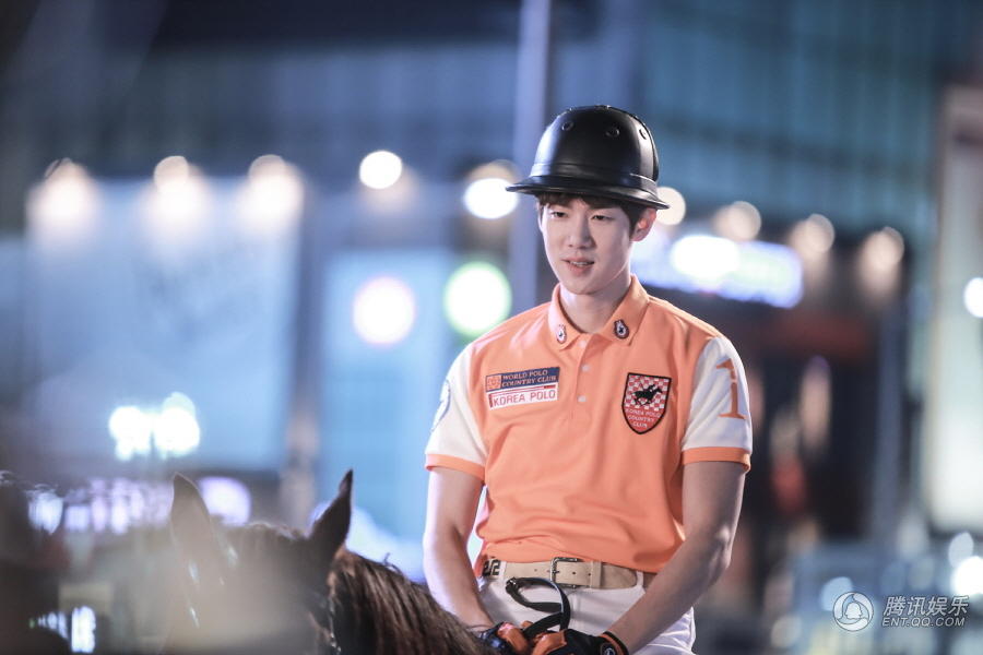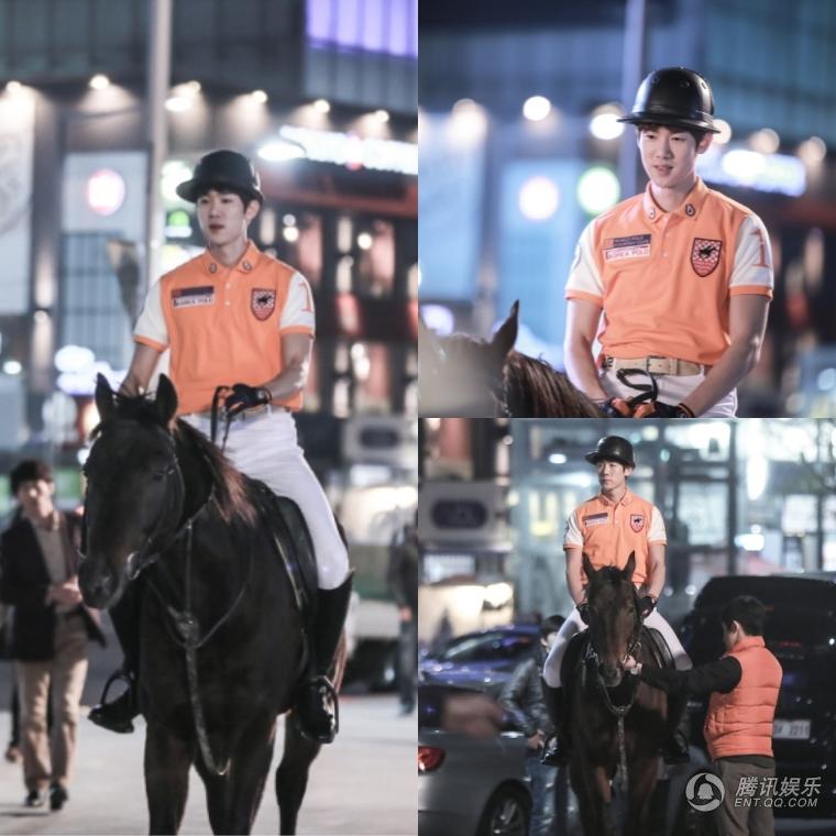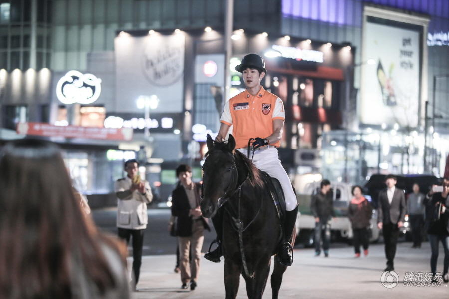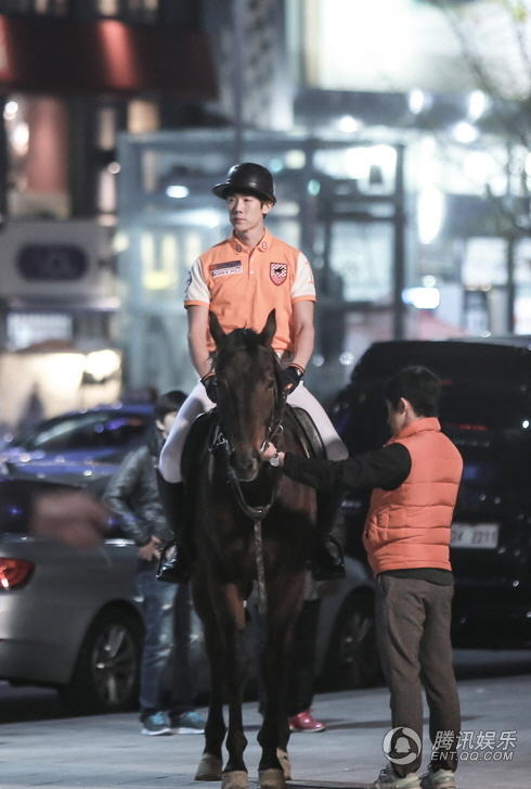 照片中,穿着亮眼橘色骑手服的柳演锡骑在一匹黑马上,独特的儒雅气质加上淡定有余的表情让他看上去犹如一位天生的贵族公子。这个场面是9日在首尔东大门附近拍摄的,柳演锡不顾在市中心拍摄的人声鼎沸,非常专心地投入演技,顺利无NG地通过了骑马的拍摄。