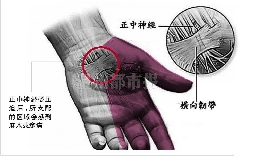 “鼠标手”,通俗地讲就是“腕管综合症”,是指人体的正中神经以及进入手部的血管,在腕管处受到压迫所产生的症状,主要会导致食指和中指僵硬疼痛、麻木以及拇指肌肉无力感。要想弄清楚“鼠标手”为什么会发生,先要了解一下腕管的结构。腕管是腕部的一个管道,它好比穿行在我们手腕中的地铁隧道,中间建有10条轨道——包括9条肌腱以及1条正中神经。腕管的空间狭小,组织坚韧,管内压力增加时很难释放。我们知道,肌腱具有良好的“抗压性”,而神经则最为容易受伤。现代越来越多的人每天长时间接触、使用电脑,这些上网族多数每天重复着在键盘上打字和移动鼠标,手腕关节因长期密集、反复和过度的活动,导致腕部肌肉或关节麻痹、肿胀、疼痛、痉挛,使这种病症迅速成为一种日渐普遍的现代文明病。