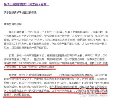 【学校占地面积确实较小】叶校长指出,学校占地面积较小,确是不争的事实,“我们学校占地仅6亩,这一情况也得到了乐清市教育局的重视。”据了解,2007年当地曾经将乐成一小发展改造列入旧城改造,但因与周边居民的赔偿事宜协商未果而搁浅。(记者 陈克力 潘涌燚)
