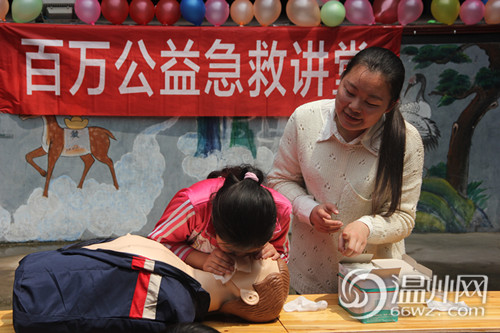 “当你看见一个人吃东西噎到怎么办?”“当你看到一个人落水失去意识了怎么办?”一连串的提问让热闹的会场瞬间安静下来,急救小老师谢巧进行真人演示,教授大家海姆立克急救法,帮助那些吃东西噎到的人以防窒息;借助人体模型,绘声绘色的向父老乡亲们教授心肺复苏术,还讲授了包扎止血的处理方法、烫伤的处理法等常见急救技能操作。小老师的表现充分展现温医大学生的素养,居民们专注的眼神充满了对生命的尊重与珍惜,很多老人听不懂普通话却一直聚精会神的观察着老师的手势然后自己比划,小朋友们全神贯注的倾听老师并且异口同声的回答老师的问题,并且亲自上台操作,动作精准,台下响起热烈的鼓掌声。图文并茂的海报也吸引了青少年的学习兴趣。