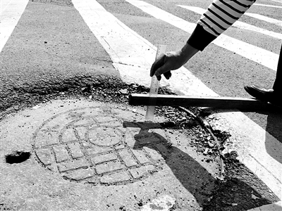 在横穿路面的斑马线上,一头的井盖高于路面约8厘米,另一端的井盖却又低于路面6厘米。尹老伯担忧地说道:“路面这样高低不平,斑马线行人较多,一个不小心很容易出现安全事故。”