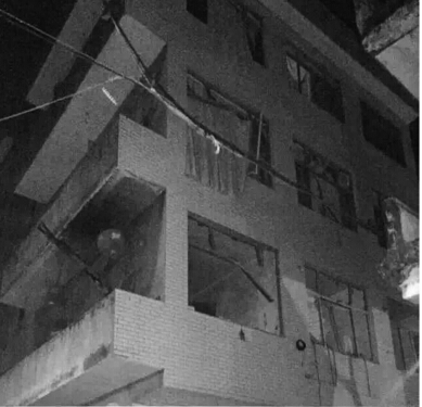 从事故发生现场的照片上,记者看到事故发生民房一楼房体一侧的墙面已被震碎,房屋前散落从二、三楼掉落的被震碎的窗户玻璃,楼上窗台处斜挂着被震出的铝合金窗户边框。当地村民描述,与发生事故的民房相连的隔壁房子,玻璃窗户遭震碎;事故房屋后门处相隔五六米远四间民宅的房门也遭毁坏。