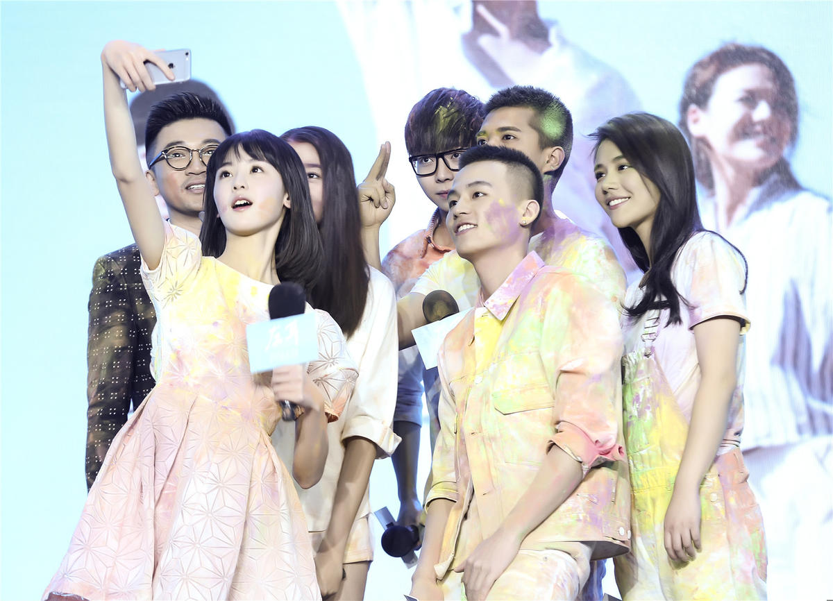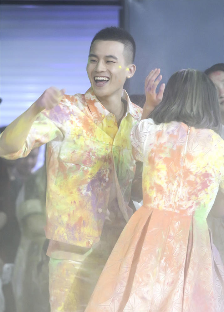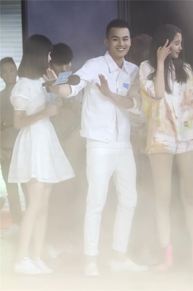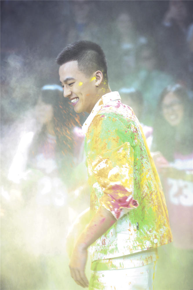发布会一开始,欧豪就以一身白衣白裤的干净形象出场,不过,这样清新的形象并没有维持太久,主持人一声令下,粉丝们拿起彩粉朝着“跳格子”的欧豪抛洒,一身清爽的欧豪瞬间变成彩人。虽然被围攻,欧豪却玩的非常高兴,甚至和粉丝一起“偷袭”其他主演。