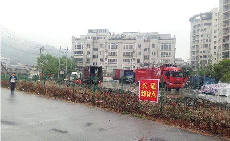 4月20日下午16时25分,记者来到现场。这块空地位于体育小区东北角,紧邻15幢和20幢居民楼,中间隔着一堵2米余高的墙。该空地大部分地面为水泥浇筑,靠近周松北路的外侧是2米余宽的黄泥地,外沿种着一些绿植,疑为绿化地块。黄泥地与道路之间有绿色铁丝网相隔。铁丝网上东侧,一张红底黄字“招牌”格外醒目,上书“兴通卸货点”5个字。铁丝网南边,一个4米多宽的通道供车辆进出,还装有电子伸缩门。沿着铁丝网走了一圈,估摸着该处占地面积约为1500平方米。
