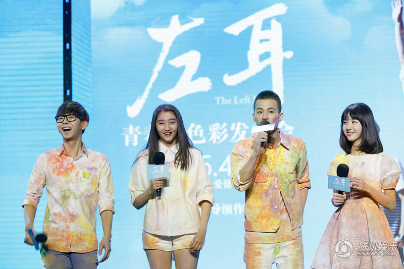 在《左耳》前期发布的角色海报中,几位主演各自被包裹在颜料撞击弥漫的粉雾中,以此诠释青春的五彩缤纷和激情悦动。发布会一开始,六位主演就玩起了童年时最爱的跳房子。而随着六位演员走入格子中间,守候多时的粉丝立刻对他们展开围攻,用色彩将他们包围。