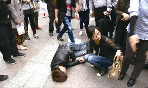 当天下午,轮休的张赟和朋友在杭州平海路利星广场的星巴克喝咖啡。当天下午5时20分左右,一名穿黑色外套的小伙子突然发病晕倒在广场人行道上。因为该广场在西湖附近,周围人来人往,小伙子晕倒后很多人围了上去。
