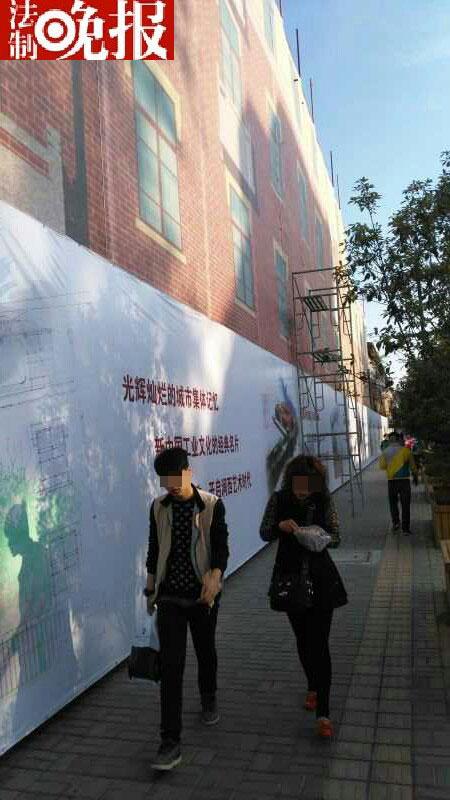 今天上午一位在此处施工的技术人员告诉法晚记者称,他们在此施工有三四天了,整面喷绘的假窗户墙壁有1000多平方,“费了很大劲才做好贴上”。