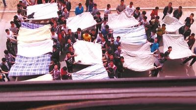 几十个“被子哥”,十几条被子形成一张安全网。图片来自于网络