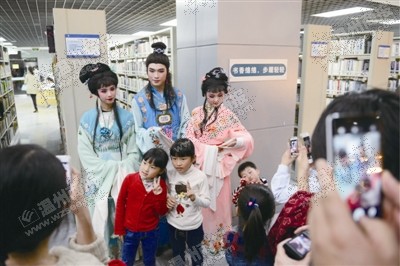 在图书馆三楼,一群市民正围着红楼梦里的林黛玉和贾宝玉拍照。“小朋友,你告诉我《红楼梦》里有哪四大家族才能和我拍照哦。可以问爸爸妈妈。”在拍照前,贾宝玉先向小朋友抛出了问题。在四楼,鲁迅小说《阿Q正传》中的主角阿Q正和4位小男孩坐在一起,讨论阿Q的“Q”的正确读法。在图书馆2楼的儿童读物区,白雪公主、爱丽丝以及魔女琪琪(宫崎骏动画《魔女宅急便》角色)都受到了小朋友的追捧。