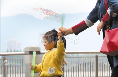 昨天,市区瓯江帆影广场,一个孩子在瓯江边玩着泡泡,不冷不热的天气让人倍感舒适。郑之越/摄
