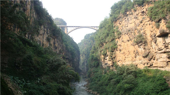 马岭河地处峡谷,峡谷之间跨越一座大桥,桥上可以看见峡谷中无数的河水漫开流到峡谷里,一缕缕飘渺的瀑布悬挂在整个峡谷间。是万峰、千岛、百瀑、奇谷、彩画的神奇地地缝为景观特色的风景名胜区。