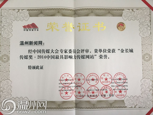 颁奖典礼上,组委会对荣获“2014金长城传媒奖”系列奖项的单位和个人进行了表彰,温州网荣获“2014中国最具影响力传媒网站”,温州网旗下温州辟谣举报平台荣获“2014中国社会治理创新奖”。