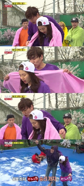 新浪娱乐讯SBS《Running Man》昨(26日)播出“危险的情侣竞赛”,李光洙和宋智孝配对成情侣,在玩改良自澳大利亚“拉喝醉老公”的游戏时,宋智孝在沾满肥皂泡泡的垫子上,拉着李光洙的两脚走,两人打败其他情侣获得第一名。