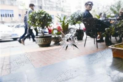 从诚达大厦28楼扔下的鹅卵石砸坏四车,还洞穿一家理发店的玻璃。徐晓春 摄
