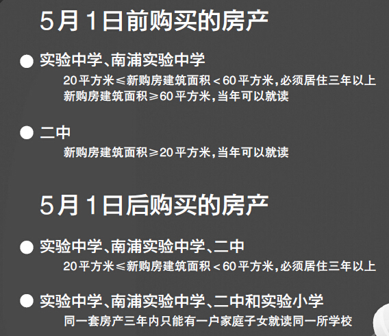 调整后规定:在温州市实验中学、温州市南浦实验中学、温州第二中学三所学校辖区内,新购房建筑面积在20平方米以上、60平方米之内的,必须达到居住三年以上(居住时间不得迟于2012年8月31日)。另外,上述三所学校和温州市实验小学同一套房产三年内只能有一户家庭子女就读同一所学校。该调整从5月1日起实施,并且采用“老人老办法,新人新办法”。(详见图)