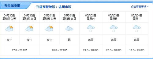 【天气预报】截止4月30日下午一点,据“温州天气”网最新消息,5月1日,温州市区多云转阴,20~27℃;5月2日,市区阵雨,21~28℃;5月3日,市区阵雨, 20~28℃。当然,更确切的小长假天气情况,大家可密切关注随后发布的最新天气预报。越近发布的天气预报越准哦!