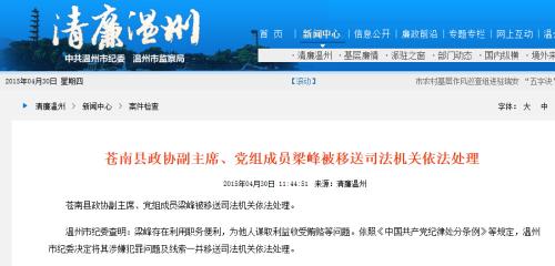 苍南县政协副主席梁峰被移送司法机关依法处理