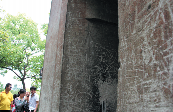 昨天,温州江心屿风景区,省级文保单位江心西塔塔身内部布满涂鸦与刮痕,竹林里不少竹子被刻了字。记者 郑之越/摄
