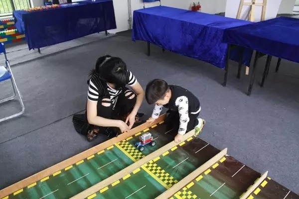 3.力量与速度游戏:每轮最多可4个孩子参加,在老师指导下搭建弹力小车、发射器,最后用自己搭建好的弹力小车进行游戏比赛。看,这个小萌宝就已经搭建好小车一试身手了!Go,go,go想着终点出发。
