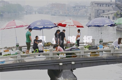 昨天下午,记者在“一环三线”南线妙鸿桥段看到,有市民在妙鸿桥老桥上贩卖蔬菜,与河水交织的图景从远处看令人心驰。但记者走近发现,该桥上菜场对桥下的塘河水造成了污染,河道中漂浮有菜叶等杂物,也有一些油脂浮在水的表层。