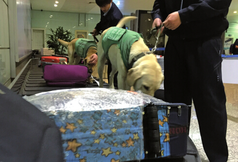 有了战果,檀涛高兴地拍了拍哈尼的脑袋:“好孩子!”受到表扬,哈尼的积极性更高了。很快,哈尼和金金又找出了两只装有火腿、香肠等违禁物品的行李箱。