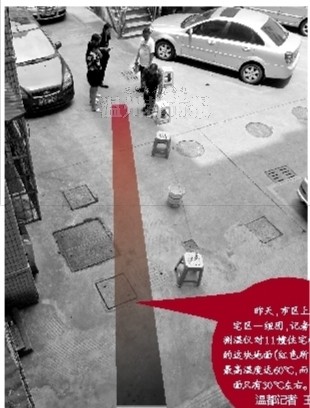 昨天,记者拿红外测温仪来到小区内测试,发现小区内被太阳照射的地面温度约为30℃,而发烫区域的地表温度最低为摄氏40℃,最高的达到了60℃以上。小区保安李师傅拿了半桶水泼在发烫的地面上,地面冒出缕缕水蒸气,水很快就蒸发了。