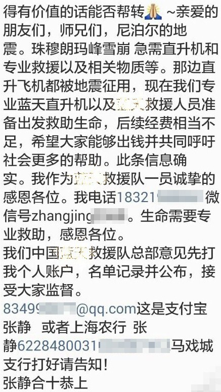 7、尼泊尔地震后蓝天救援队求捐款