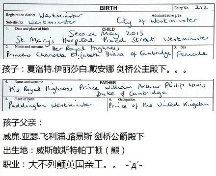 小公主名字一栏填写的是:夏洛特·伊丽莎白·黛安娜剑桥公主殿下;而孩子父亲的职业一栏填写的是英国亲王;孩子母亲职业一栏填写的是英国王妃;而地址栏简短的写道:肯辛顿宫。