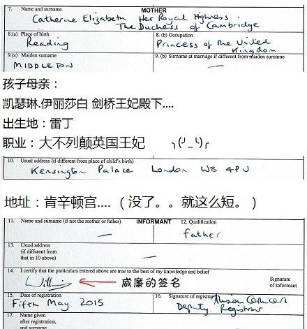 孩子母亲职业一栏填写的是英国王妃;而地址栏简短的写道:肯辛顿宫。