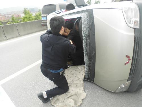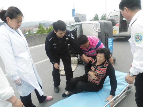 民警仅用3分钟就赶到了事故现场,在现场,民警发现一辆三菱面包车侧翻在道路中间,车辆已经有些变形,有2人受伤并被困于车内(一名驾驶员和一名60岁左右的老太)。其中,老太不停地在车内痛苦地呻吟,民警迅速拨打120急救电话。