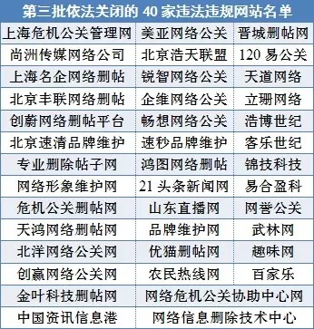 5月5日,记者从国家互联网信息办公室获悉,近日,40家涉嫌从事网络敲诈、有偿删帖等违法违规活动的网站被关闭。这是“网络敲诈和有偿删帖”专项整治工作开展以来,互联网主管机关集中关闭的第三批违法违规网站,数量较前两批有所增加,专项整治的力度进一步加大。