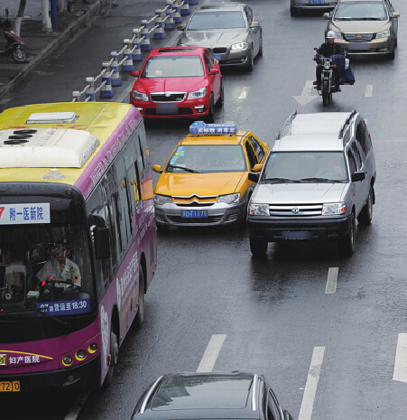 上周五下午3时20分~3时50分,记者站在南站天桥上目睹了27起车辆随意变道的交通违法行为,且90%的车辆变道时不开方向灯,直接压道路实线变道,在这27起中,公交车有2起,出租车8起。