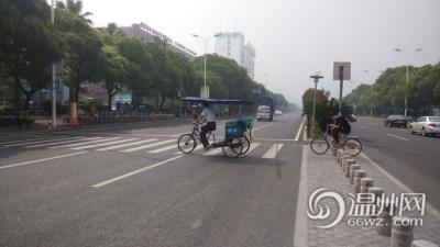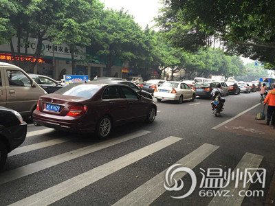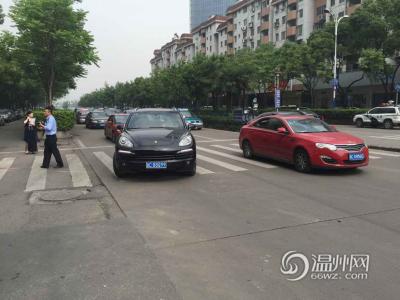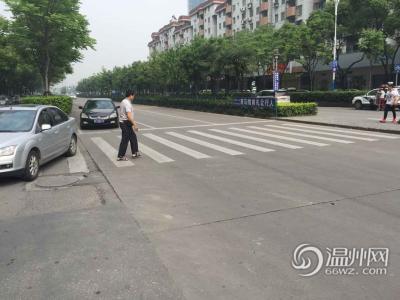 王师傅在交警三大队一中队当协警,正站在飞云江路的斑马线上。他说,极个别车主会礼让行人,而且看到行人仍站在斑马线上,还会挥手示意,让他们先走。(记者 项锐)