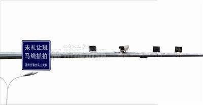 【记者实地走访查看“视频动态识别”监控】这里是龙湾区机场路飞云江路段,全市在两处建设了“视频动态识别”监控,这里就是其中一处。这项针对车辆是否有在斑马线礼让行人的抓拍技术,目前正处于试运行阶段。(记者 项锐)