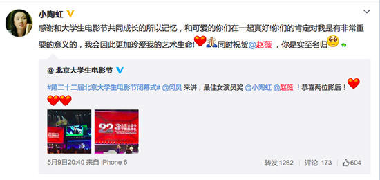 著名演员赵薇与陶虹一起获得此次大学生电影节“最佳女演员”的荣誉,陶虹在颁奖礼结束之后发布微博,除了再次感谢“大影节”给予她的肯定之外,也祝贺赵薇获奖,称赞她为“实至名归”。