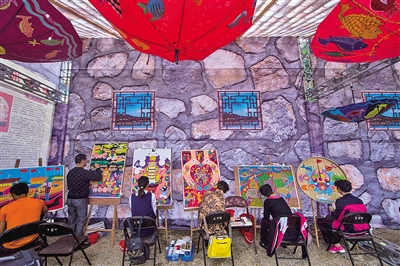 家住北岙街道的杨金花老人,坐在一幅色彩斑斓的渔民画前,认真勾勒着画面。一幅以丰收季节渔民收获海产,拉网捕鱼为主题的创作跃然纸上。“海边出生、长大,我虽然没有经过系统的绘画学习,但我有爱海岛、爱渔村的情感,画画就是一件自然而然的事。”杨金花老人今年72岁,她和其他画友的作品,已多次在县文化馆展览。
