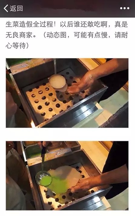 近日,微信朋友圈被“生菜造假”的消息刷屏了。消息用9张动态图演示用一种白色液体和绿色液体放入水中,制造“假生菜”的过程,并配文,以后谁还敢吃啊,真是无良商家。