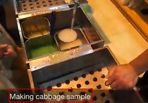 辟谣君调查了解到消息中的9张动态图是来自一段日语视频。视频中制作“圆生菜”模型的片段明显用英文表明“making cabbage sample”(中文:卷心菜样品制作),视频还配有详细制作的解说,里面的内容和网络传播“生菜造假”的动态图内容一样。在视频里,明显能看出有两名小孩在一旁观看。