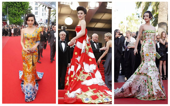 还有人指出张馨予是想学“红毯女王”范冰冰的中国风,结果走歪了。范冰冰2010-2012连续三年以黄金龙袍、仙鹤装、China瓷闪耀戛纳。